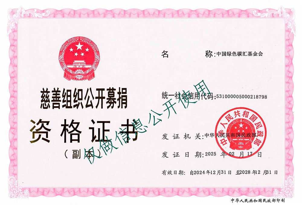 中國綠色碳匯基金會經民政部認定為慈善組織并獲得公開募捐資格。